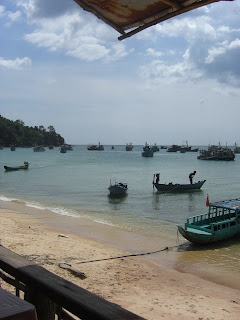 The whole of the North is a verdant green mountainous interior, fringed by mile after mile of deserted white beach. We drive along stopping every so often for a paddle and a photo – but the good news is that this guide is not a David Bailey – so no pics of me! We pass the mangrove forest and the roads get worse (we left behind tarmac roads in Duong Dong – we had been on dirt tracks for the rest of the time). But then the roads got even worse – we arrive at a “junction” and no road signs here. My sense of direction said turn right – their’s obviously said turn left which we did. My Vietnamese still isn’t good, but it’s surprising what you can understand by tone of voice. The guide’s tone of voice was saying “what the hell is going on, have you any idea of where we are” and the driver‘s was saying “no, I haven’t a clue but if we keep going confidently on, the old bird in the back may not notice….”. We reach a river down a track with no way to cross it, so we carry on in completely the wrong direction, back into the forest. I had visions of the Mekong again, sleeping in a mini van this time rather than a boat. Both my escorts were looking a little worried – there was no other traffic and apart from a few pepper plantations, no other life to be seen. But suddenly (a few seconds after I had realised that we were back the road we had already covered on the way out), the guide triumphantly pointed to the map – they knew where we were…. But we had seen the wider, north part of the island. Due to the forest, there is very little population here, in fact 90% lives in and around Duong Dong, the small capital. We had stopped at another beautiful crescent bay which was the home of a tiny fishing village, and the land we could see five kilometres away was Cambodia. Very close, but no border crossing, to get to Cambodia (legally, that is) you have to go back to the Vietnamese mainland. The boats gathered in the bay, along with a few floating houses all looked very ramshackle.